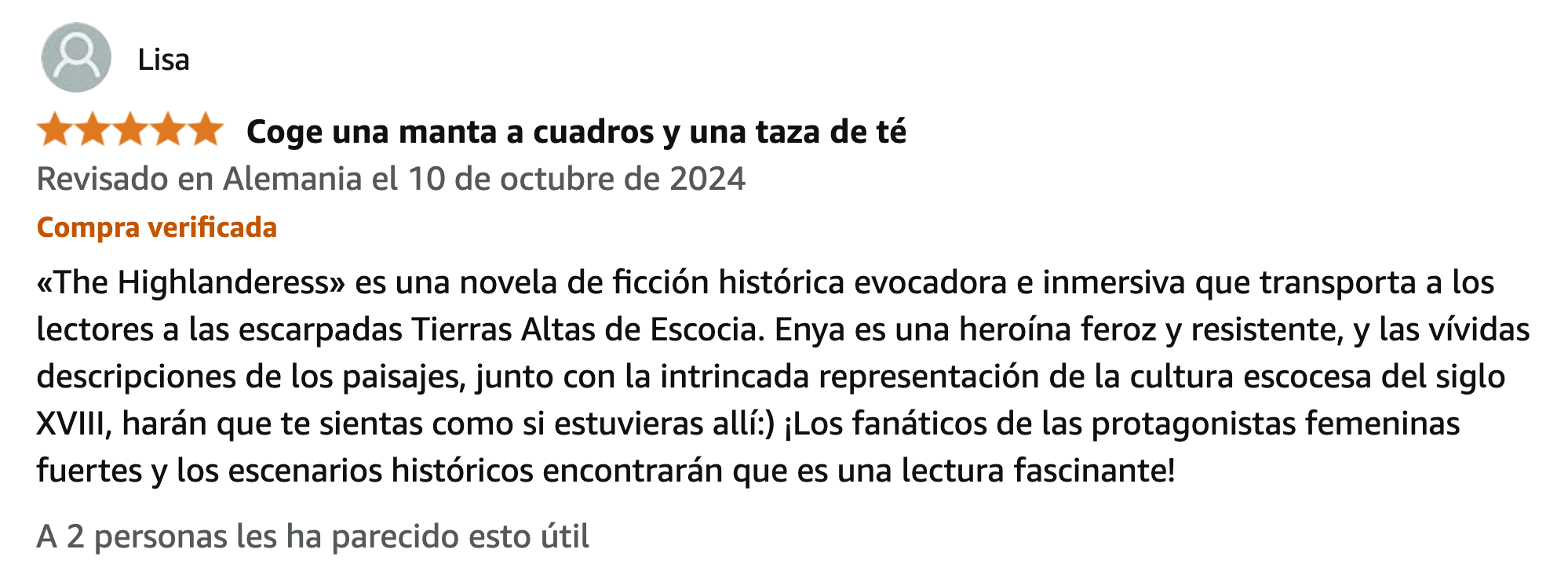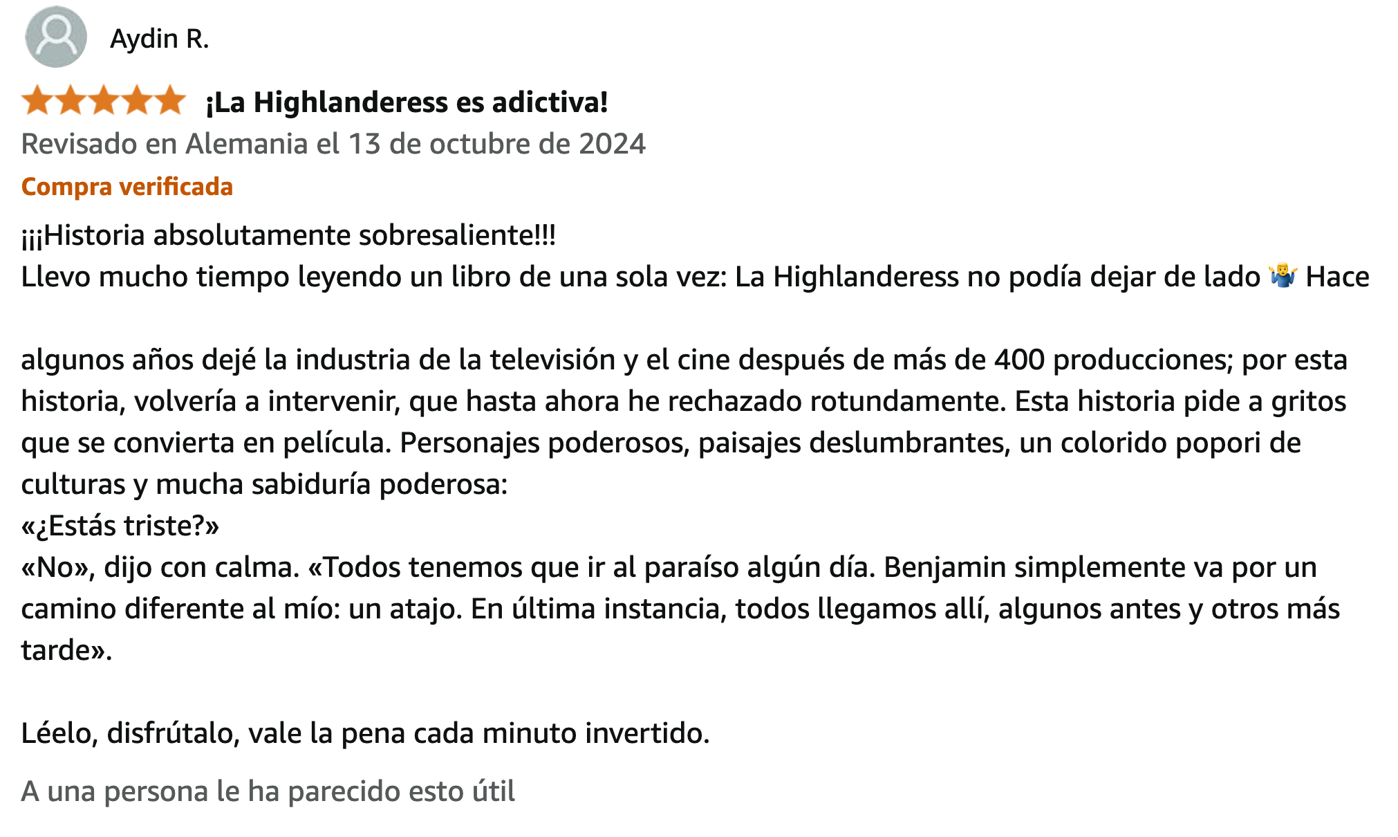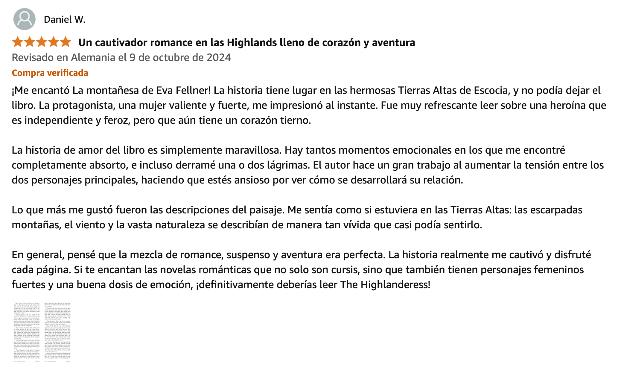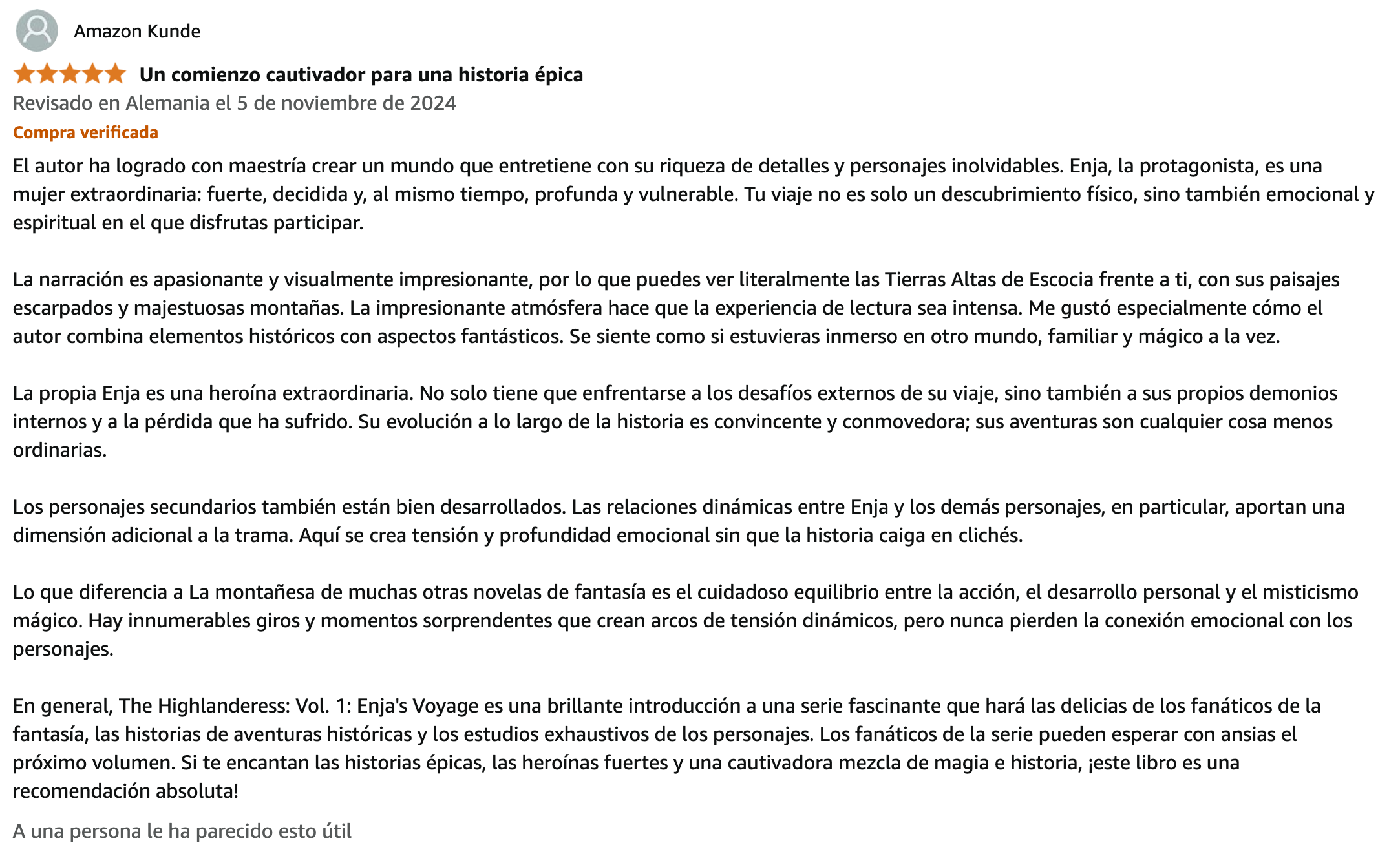 Todas estas reseñas provienen de la versión original en alemán de Die Highlanderin, traducidas automáticamente desde la página alemana de Amazon del Volumen 1. Ten en cuenta que "The Highlanderess" (al igual que "Die Highlanderin") es un término único, y a menudo se traduce simplemente como "La montañesa". Estas son solo algunas de las más de 1.200 reseñas entusiastas que puedes encontrar en Amazon. Próximamente también compartiremos reseñas orgánicas de la versión en inglés de The Highlanderess. Por ahora, disfruta de estas reflexiones y deja que te inspiren.