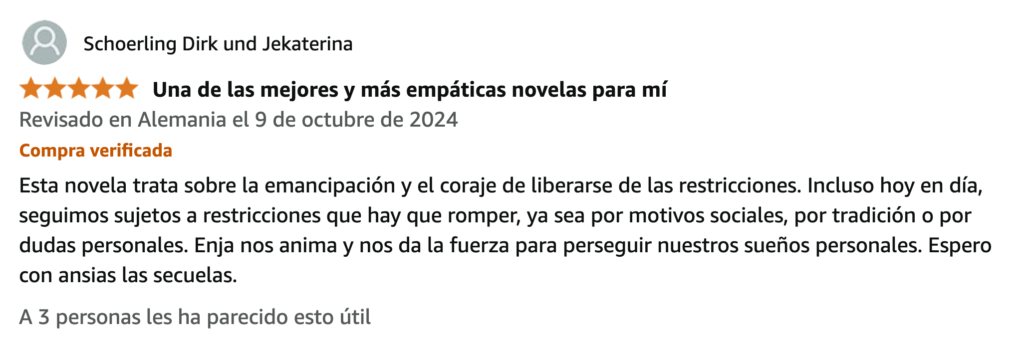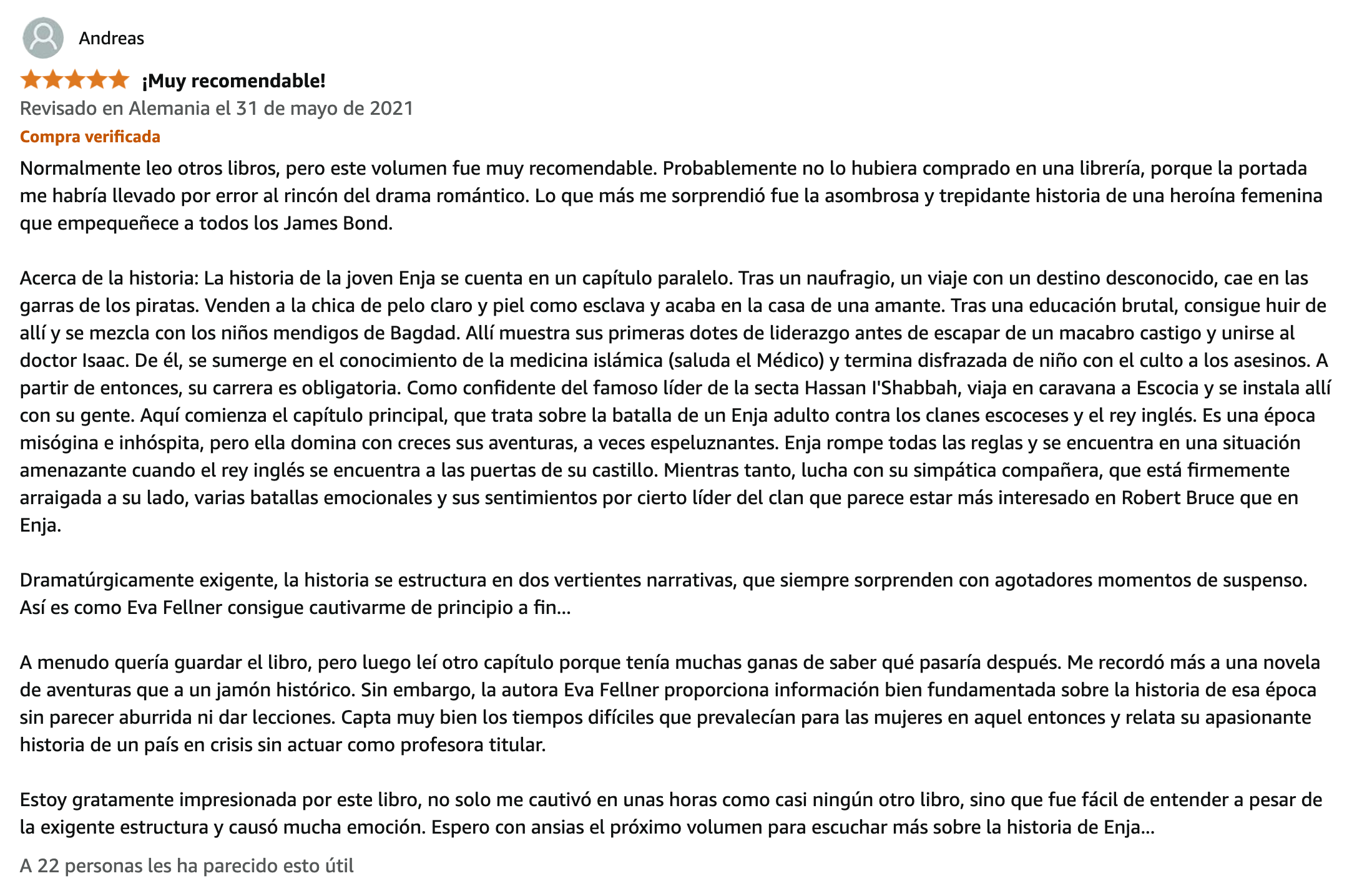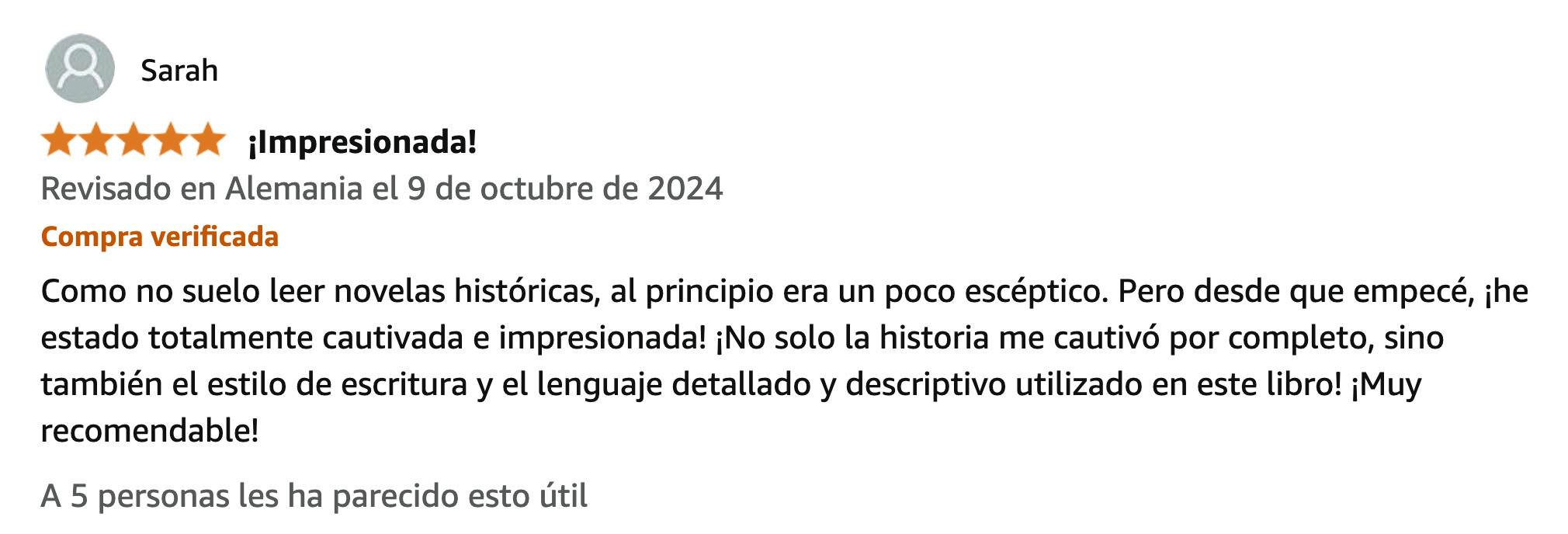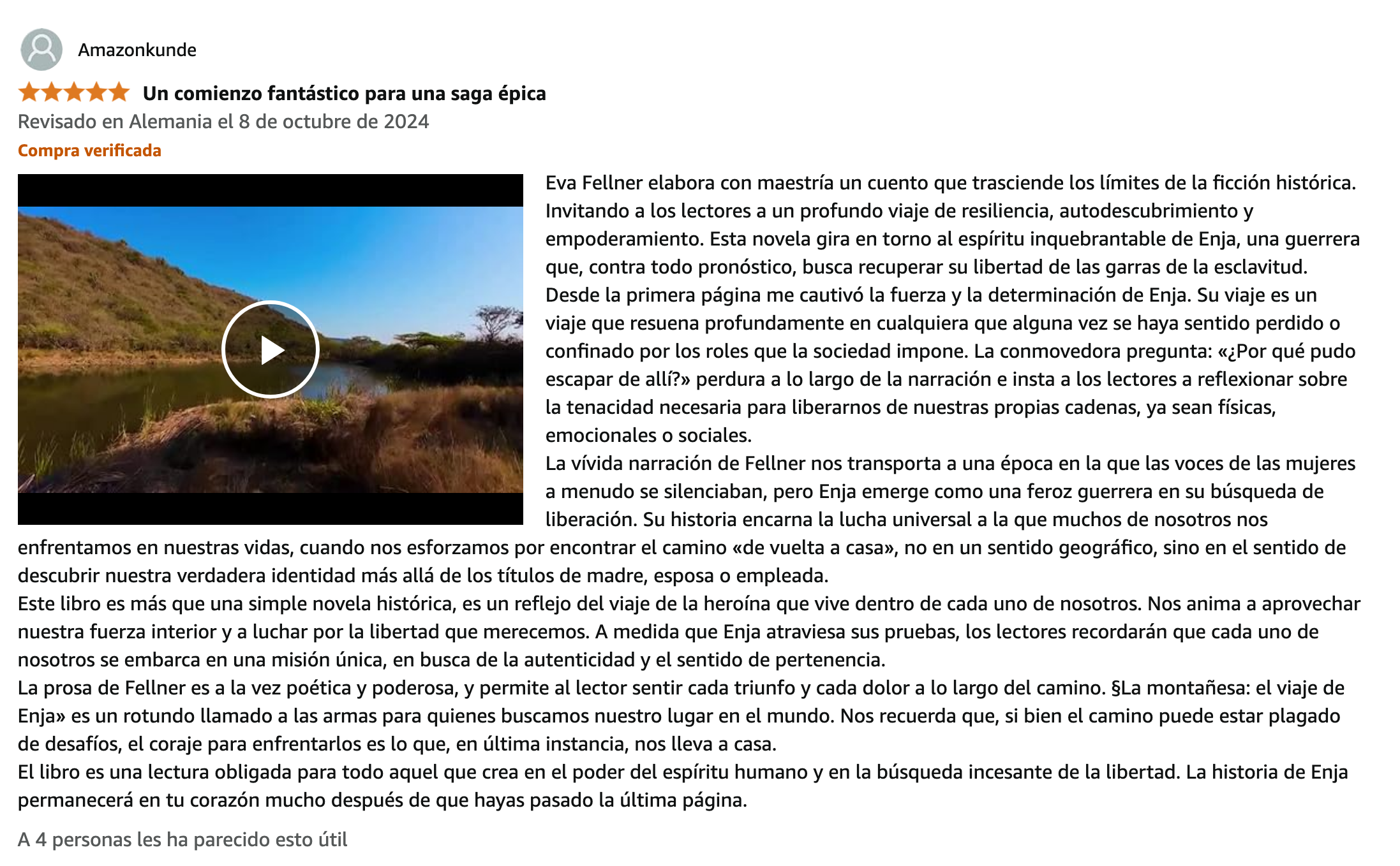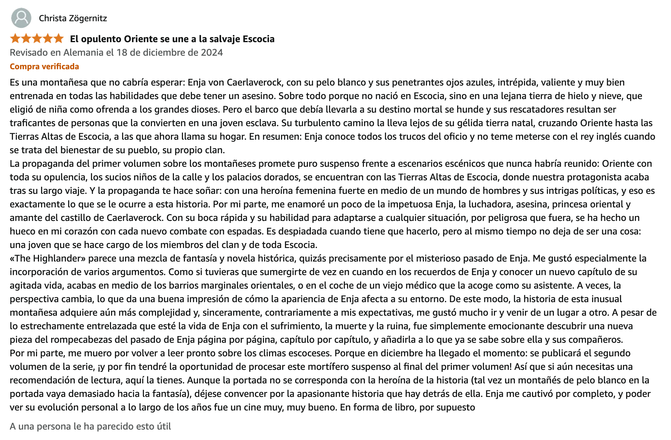 Todas estas reseñas provienen de la versión original en alemán de Die Highlanderin, traducidas automáticamente desde la página alemana de Amazon del Volumen 1. Ten en cuenta que "The Highlanderess" (al igual que "Die Highlanderin") es un término único, y a menudo se traduce simplemente como "La montañesa". Estas son solo algunas de las más de 1.200 reseñas entusiastas que puedes encontrar en Amazon. Próximamente también compartiremos reseñas orgánicas de la versión en inglés de The Highlanderess. Por ahora, disfruta de estas reflexiones y deja que te inspiren.